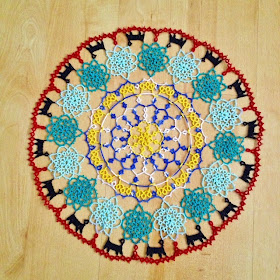 I was eager to see the results and now that it is finally done, I am a little sad. Tatted in a mixture of Size 20 threads from Flora and Lizbeth, the original colour scheme which I planned on, changed as I tatted. There was a slight size difference in the Size 20 of the two threads but it isn't too noticeable.